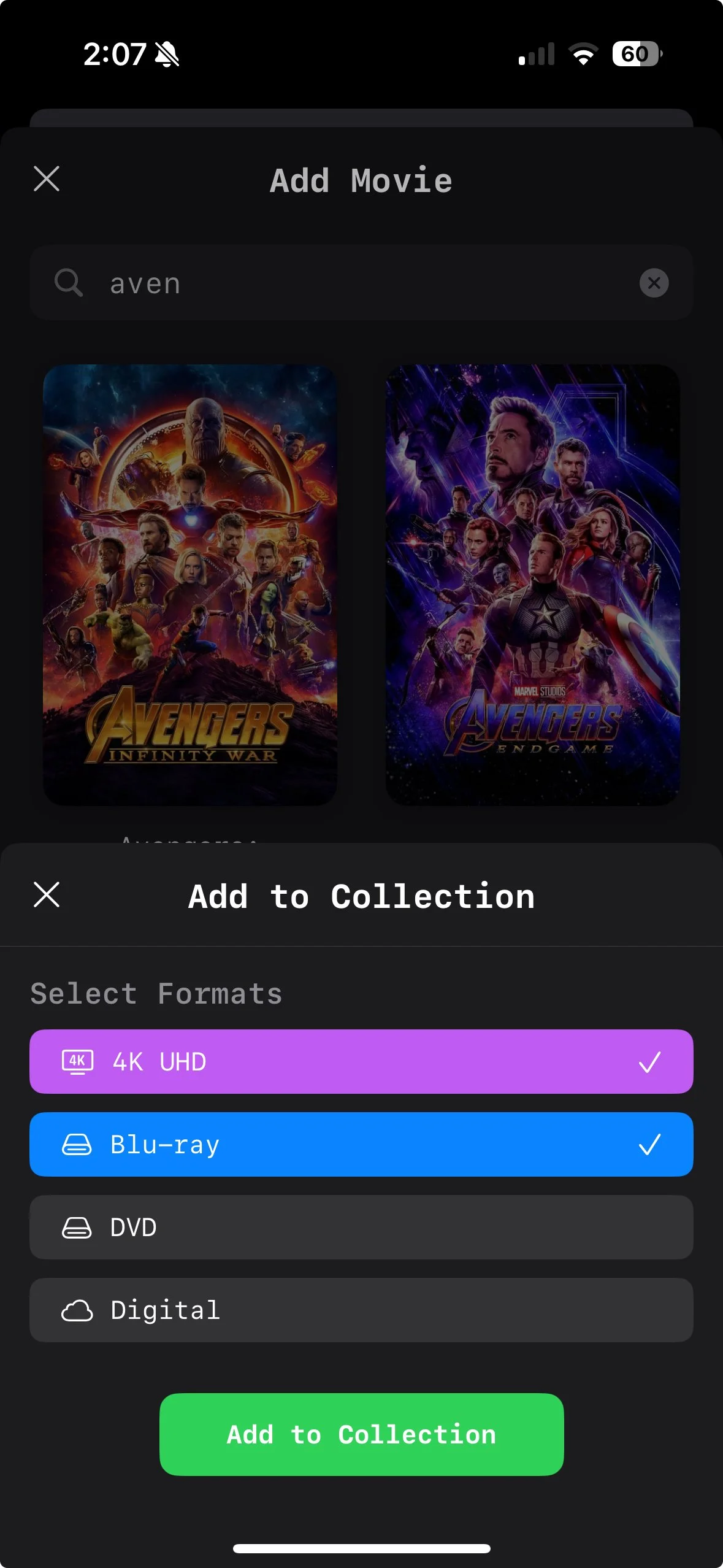 Whether you're a dedicated 4K collector or mixing physical and digital, shelf helps you track exactly how you own each film. Add movies to your collection in 4K Blu-ray, standard Blu-ray, DVD, or digital formats. Never accidentally buy the same movie twice in the same format again.